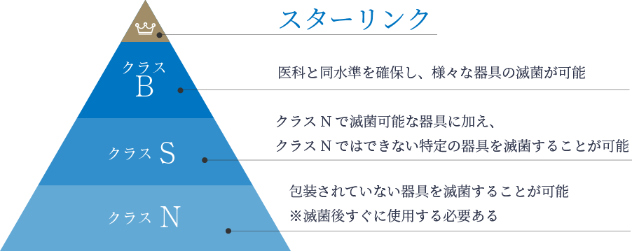 ヨーロッパの厳しい基準(EN13060)で最高ランクとされる「クラスB」相当の滅菌性能を持ち、熱や湿気に弱い器具も安全に滅菌できます。